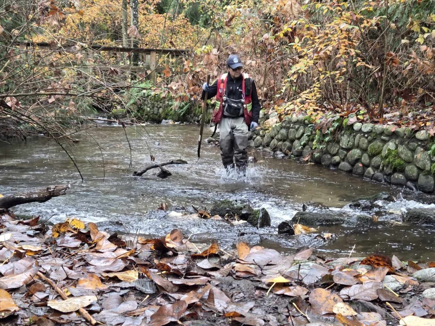 Participants walk in chest waders in and around the stream including stepping over fallen trees, walking on in-stream rocks and muddy banks, and crouching under overhanging tree branches to identify salmon species targeting chum and coho but occasionally other species (chinook, pink) may have been seen.