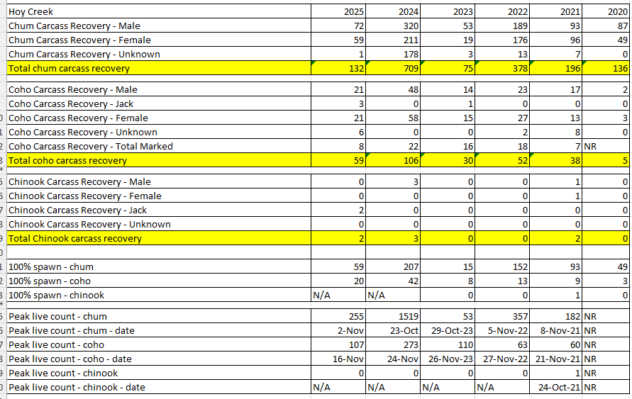 Here are the survey details which provide totals of carcasses for chum and coho, as well as peak live counts.